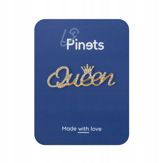Goldinschrift „Queen“ mit einer Krone – Brosche mit Zirkonia