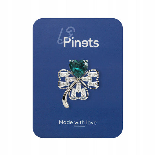 Silbernes Kleeblatt mit grünem Herz - Brosche mit Zirkonia