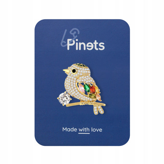 Goldener Vogel mit roten Blumen - Brosche verziert mit Zirkonias