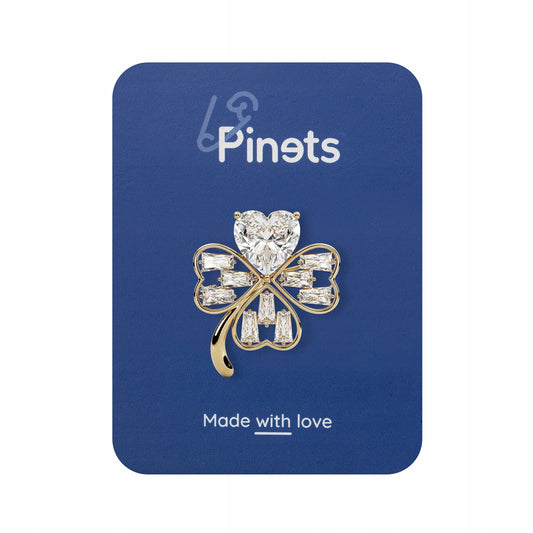 Goldenes Kleeblatt mit weißen Zirkonen und einem Herz – eine Glücksbrosche