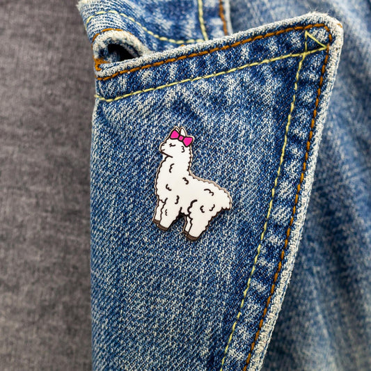 Weißes Alpaka mit rosa Schleife - eine schöne Anstecknadel