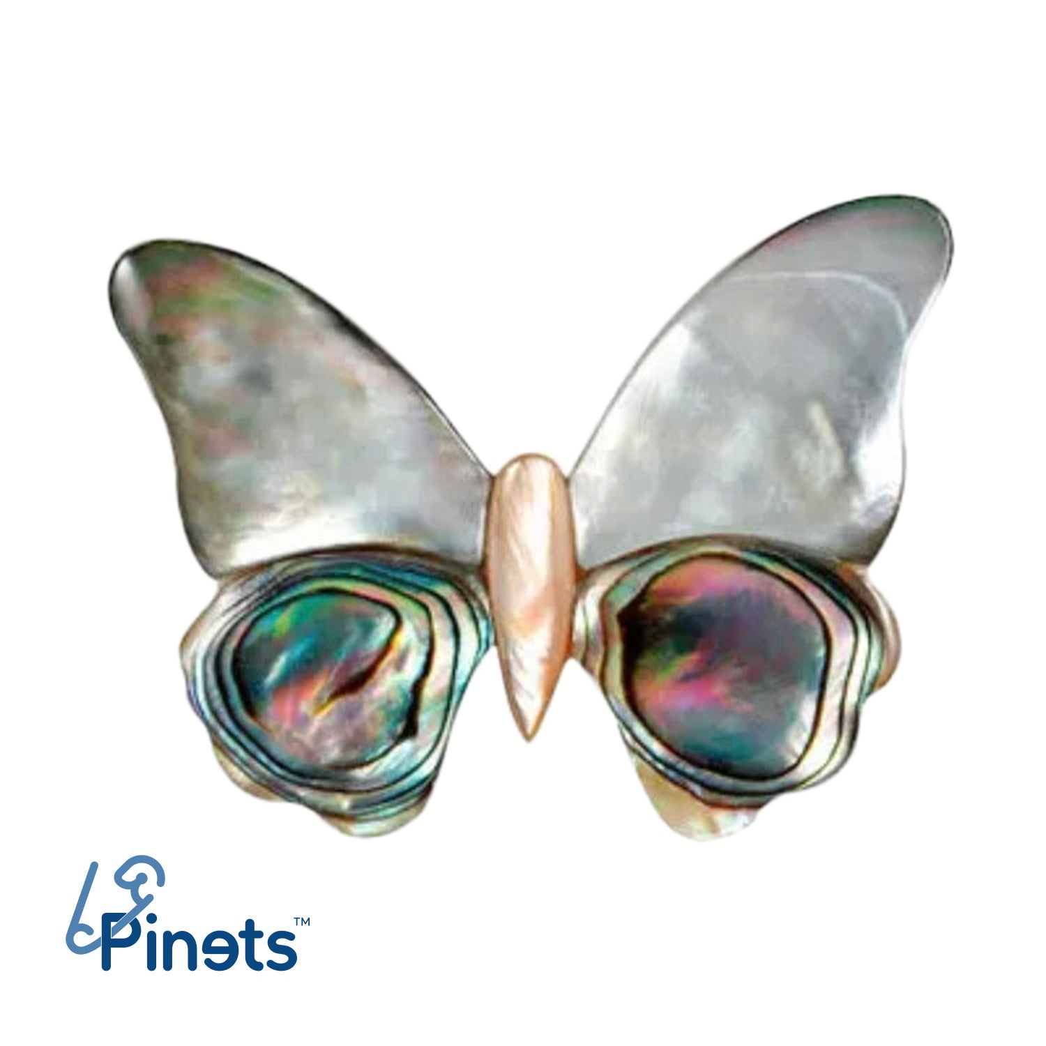 Eine skurrile Brosche mit Schmetterlingsmotiv, verziert mit Perlmutt. Sie verfügt über einen Sicherheitsnadelverschluss, der sich leicht an jedem Kleidungsstück oder Accessoire befestigen lässt. Dieser Verschluss hält den Schmuck sicher an seinem Platz, sodass Sie sich keine Sorgen machen müssen, ihn versehentlich zu lösen und zu verlieren.