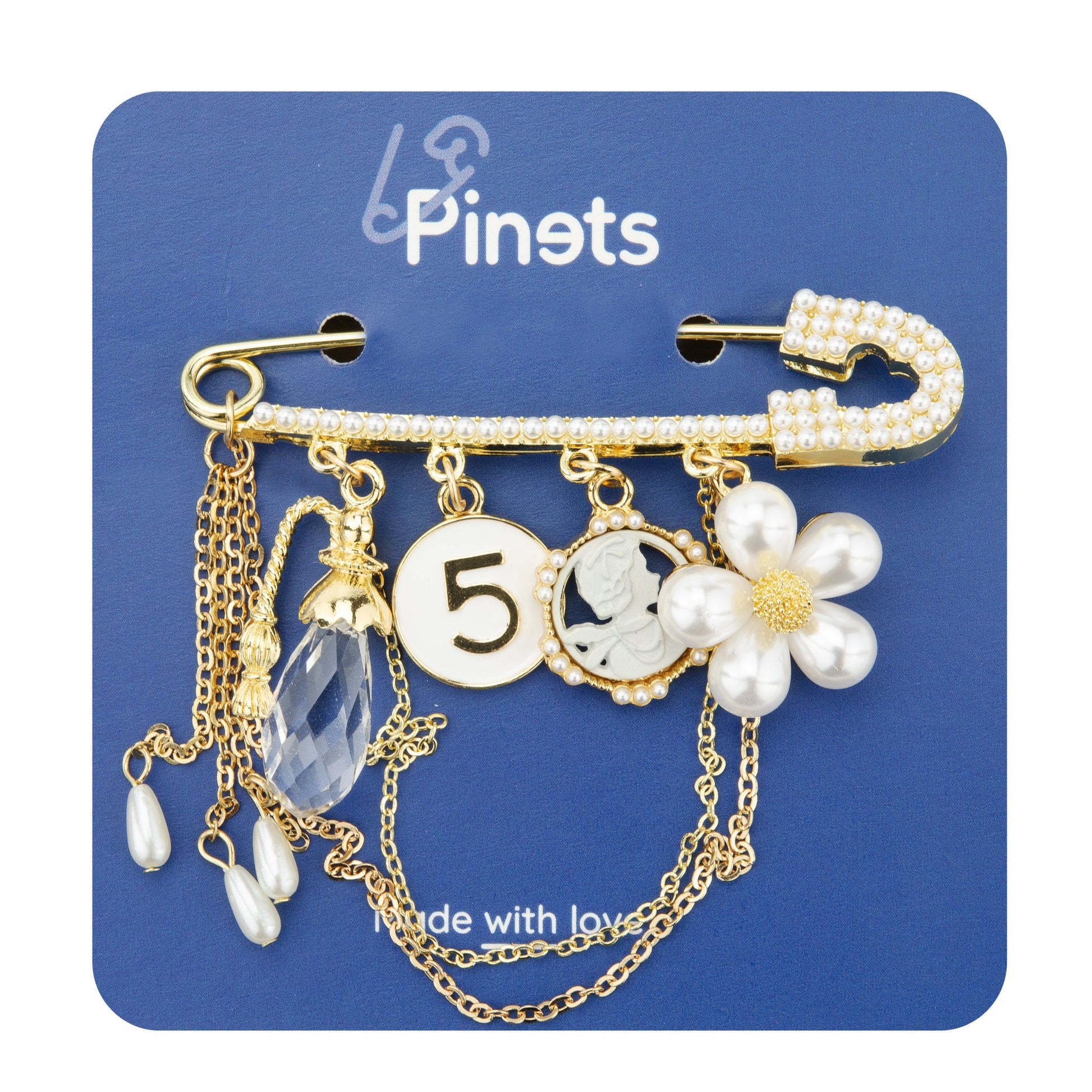 Schätzen Sie einzigartigen Schmuck? Möchten Sie zu jedem Anlass elegant aussehen? Diese Sicherheitsnadelbrosche mit goldenen Anhängern ist perfekt für Sie! Genießen Sie die schönen Details. Eine perfekte Geschenkidee. Eine tolle Ergänzung für alltägliche und außergewöhnliche Outfits.